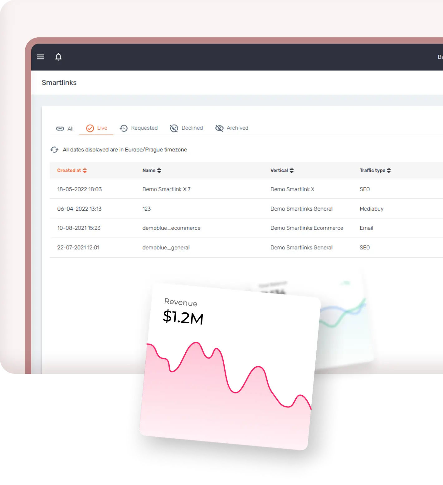 Now you can quickly get visibility into your traffic activity and boost your sales. Our AI-driven traffic delivery optimization solution has made it possible to significantly reduce expenses on support managers and manual funnel optimization to let you focus on other crucial aspects of your business. Advertisers are able to customize their offers to reflect different geo, traffic types, demographics to match specific daily caps and rates, and let the smartlink do the job, directing matching visitors to specific matching offers.